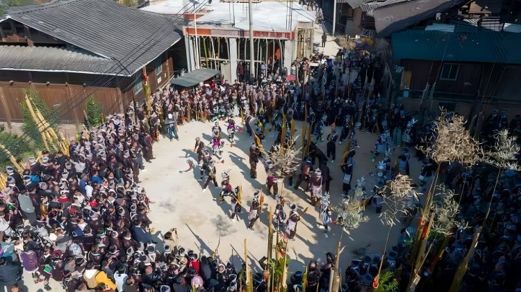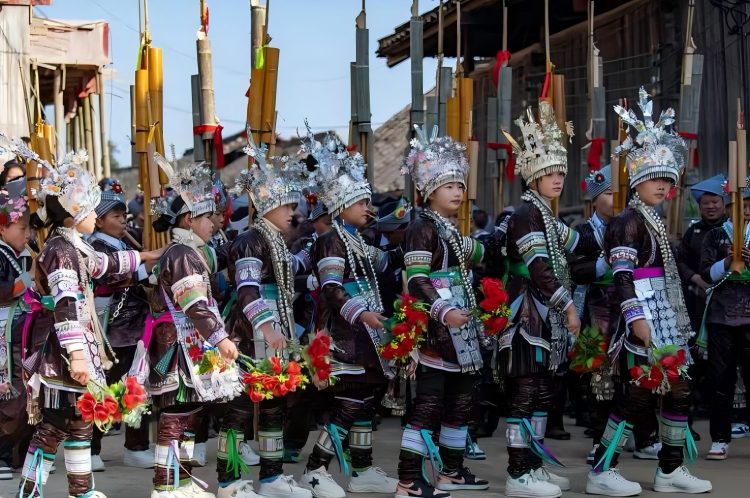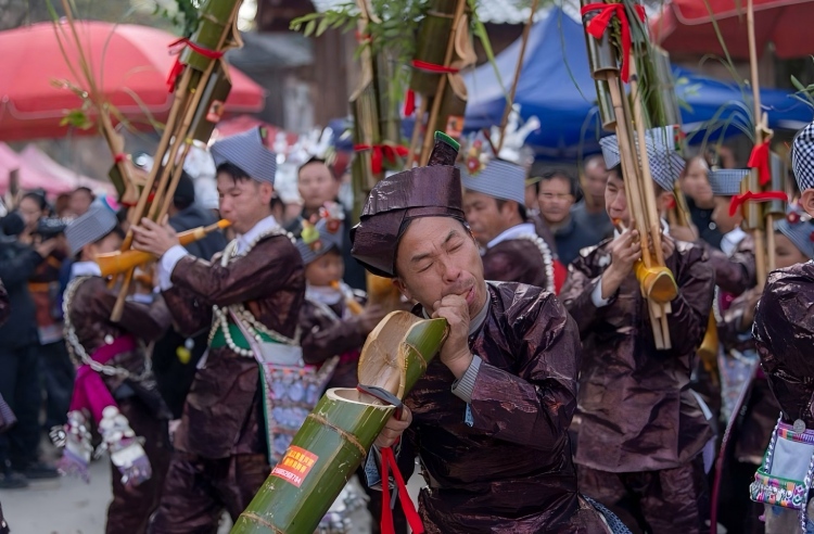 1월 7일, 귀주성 검동남묘족·뚱족자치주 종강현 병매진 대당촌에서는 매년 열리는 전통 로생제(芦笙节)가 열렸다. 묘족 동포들은 명절 복장을 차려 입고 로생을 불며 한자리에 모여 노래와 춤으로 풍년을 함께 축하했다. 사진은 로생을 부는 묘족 동포들이다.