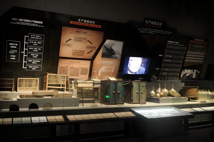 중국침략일본군731부대죄증전시관에 전시된 세균무기 생산 소개.