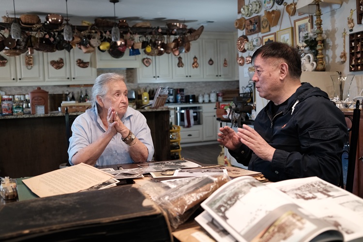 방려 감독이 웨인라이트 장군의 병사인 휴버트 캐럴의 딸 아델 위긴스를 취재하고 있다.